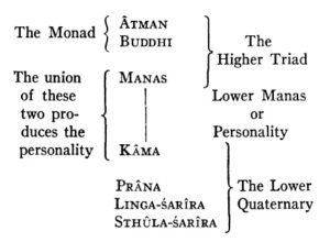 The Monad (Atman and Buddhi) represents that high spiritual source of all that is noble and inspiring in our human existence. The lower three principles in the Diagram (Prana, Linga-sarira, Sthula-sarira) are the body of man, both astral and physical, and the vitality that courses through them as long as our life on earth lasts. But what we are particularly concerned with for our present study is the intermediate portion of the Diagram, for it is the seat of the ordinary individual, made up of mind (Manas) and emotions (Kama).